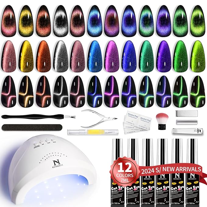 - ✨All in One Gel Nail Polish Kit: noirwhite cat eye gel nail polish kit come with all your salon-quality nail art needs: 1*Powerful UV LED Lamp, 12*7ml Cat Eye Gel, 1*7ml Base Coat, 1*7ml Top Coat, 1*7ml Black Gel, 1*7ml White Gel, 2* Magnet Stick, 1*Cuticle Oil Pen, 1*Nail File, 1*Steel Pusher, 1*Cuticle Fork, 1*Cuticle Trimmer, 1*Nail Brush, 1*Nail Clipper, 6*Nail Wipes