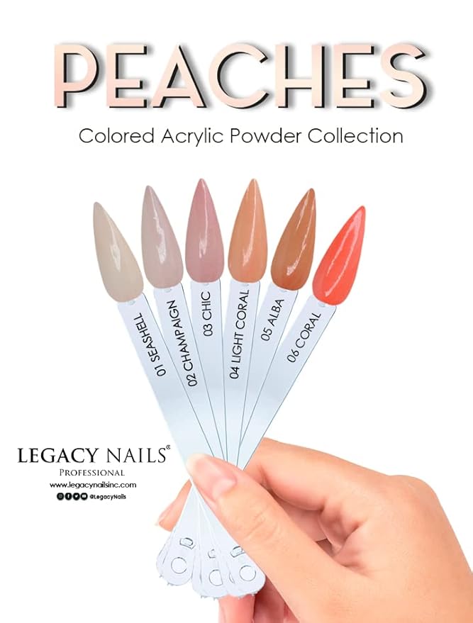 - ✨ Legacy Nails Peaches Acrylic Powder Collection has a special blending formula which provides flawless consistency and superior adhesion while delivering exceptional strength and durability to nails enhancements.