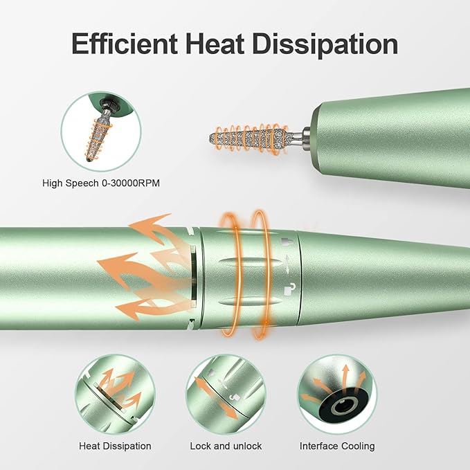 - 【Efficient heat dissipation】The handle and interface of the electric nail file have cooling holes for quick heat dissipation. Low heat, low vibration, low noise, long-term smooth operation, easy and safe to use, don't worry about affecting others. And the nail e-file is easy to operate, both professionals and beginners can easily master it!