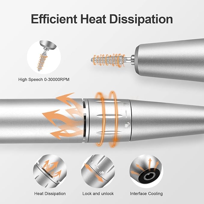 • 【Efficient heat dissipation】The handle and interface of the electric nail file have cooling holes for quick heat dissipation. Low heat, low vibration, low noise, long-term smooth operation, easy and safe to use, don't worry about affecting others. And the nail e-file is easy to operate, both professionals and beginners can easily master it!