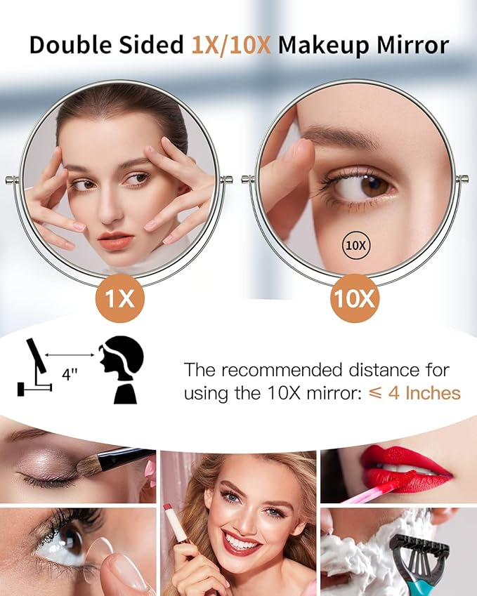 - 【DOUBLE SIDED 1X/10X MAGNIFICATION】- Benbilry wall mounted mirror has two sides - 1X/10X. 1X side is perfect for basic skincare and makeup application. 10X magnifying side can zoom in on your facial features, allowing you to see your face clearly, making sure that every detail of your hair and makeup is in place. Ideal for applying in makeup such as wearing contact lenses, tweezing eyebrow, haircut, and shaving, etc