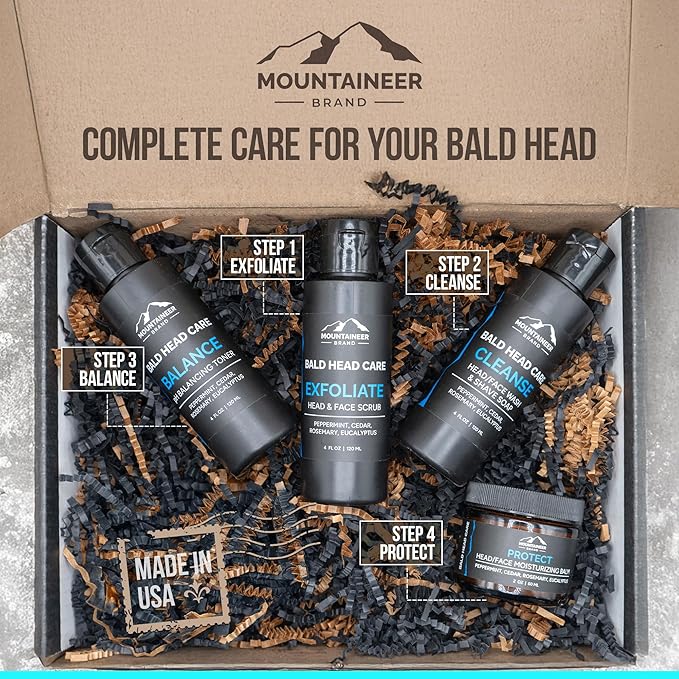 - COMPLETE BALD HEAD CARE: Look and feel amazing with Mountaineer Brand’s simple 4 step Bald Head and Facial Care bundle. Follow the steps to cleanse, remove dirt from pores and moisturize your face and scalp for hydrated and naturally refreshed skin.