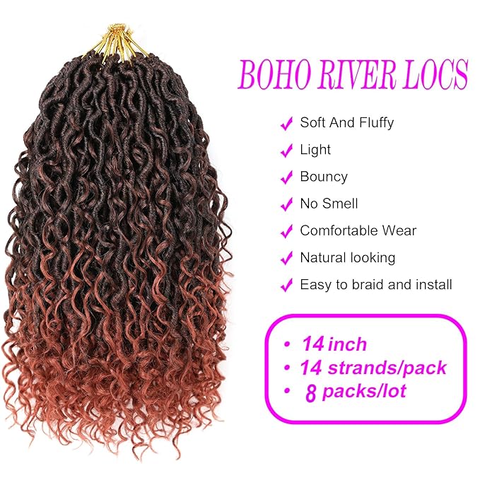 Aipin New Goddess Locs Crochet Hair 14 Inch Boho River Locs Hippie Locs Wavy Crochet With Curly Hair In Middle And Ends Braids Hair Extensions (8 Packs,14 inch, T350)