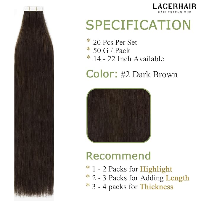 - 【Recommended Quantity】-- We Recommend 2-3 Packs for a Full Head Thin Hair, 3-5 Packs For Thicker Hair. Each Pack Of Lacerhair Tape in Human Hair Extensions is 50g, 20pcs, Light Weight.