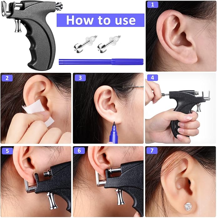 - Easy to use: equipped with headset piercing auxiliary tools, ear piercing gun will be easy to hold, firstly wash your hands, mark the place you want to pierce, aim, press, finish, the earrings will stay where you want, will not slip easily and hard to hurt skin