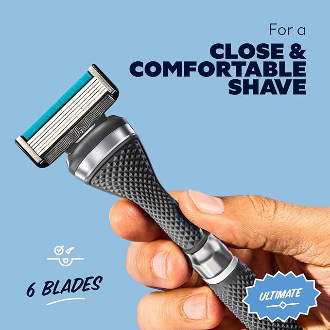 - Six stainless steel blades designed for an extra close and comfortable shave.