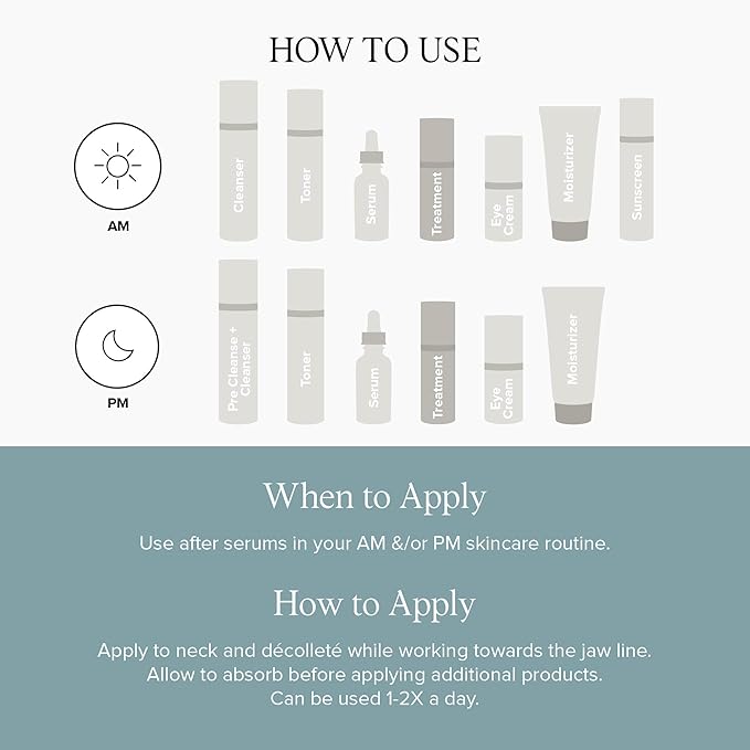 - Unique Peptide Complex: The firming neck cream contains a uniquely blended peptide complex to target the appearance of crepey skin and strengthen the skin barrier to prevent moisture loss.