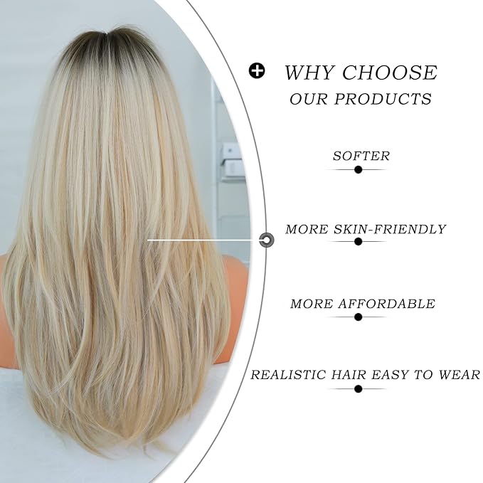 7JHH WIGS Long Blonde Wig with Bangs for Women,Heat Resistant Fiber 25 Inch Layered Synthetic Hair Wigs with Dark Roots for Daily Use