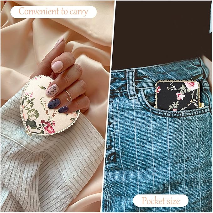 - Suitable Size: pocket mirror of different shapes has different sizes; The round shape is approx. 3.1 x 2.7 x 0.6 inches, the rectangle is approx. 2.8 x 2.6 x 0.6 inches, the heart shape is approx. 2.7 x 3.1 x 0.6 inches, and the oval is approx. 3 x 2.4 x 0.6 inches