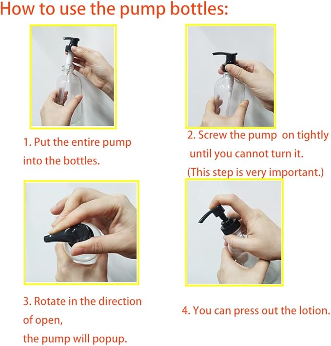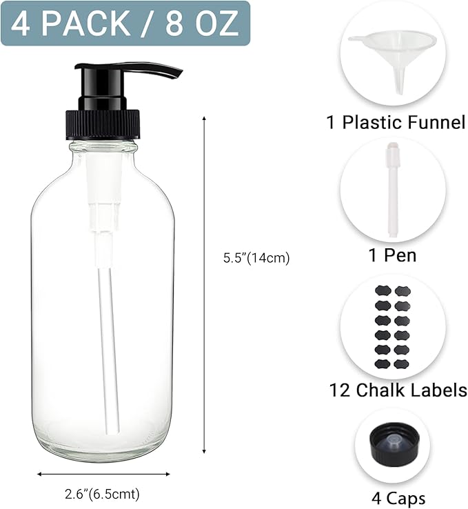 - Package:4 pack 8 oz Clear Glass Bottles with Pumps, 4 caps, 12 chalk label, 1 funnel, 1 pen