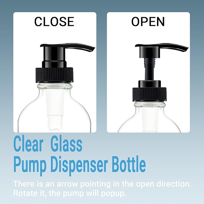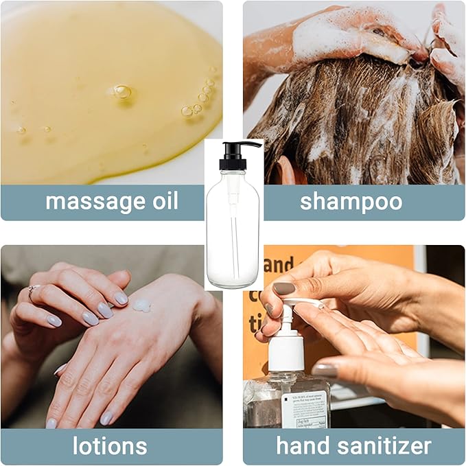 - 8 oz clear glass pump bottles perfect for soaps, lotions, essential oil, hand soap, body wash, creams, shampoo, conditioner, face wash, hair oils, homemade ginger/olive oil