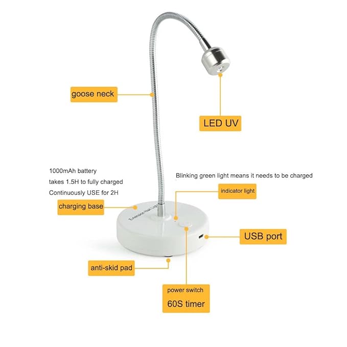 - Easy To Use : The Cordless Gel Nail UV Light With One-click Light Stand Gooseneck Design, Convenient To Switch The UV Nail Lamp On And Off, Stable Base Can Be Used To Hang And Keep The UV Led Nail Lamp Flat On The Desktop, A Variety Of Ways To Meet Your Different Needs.