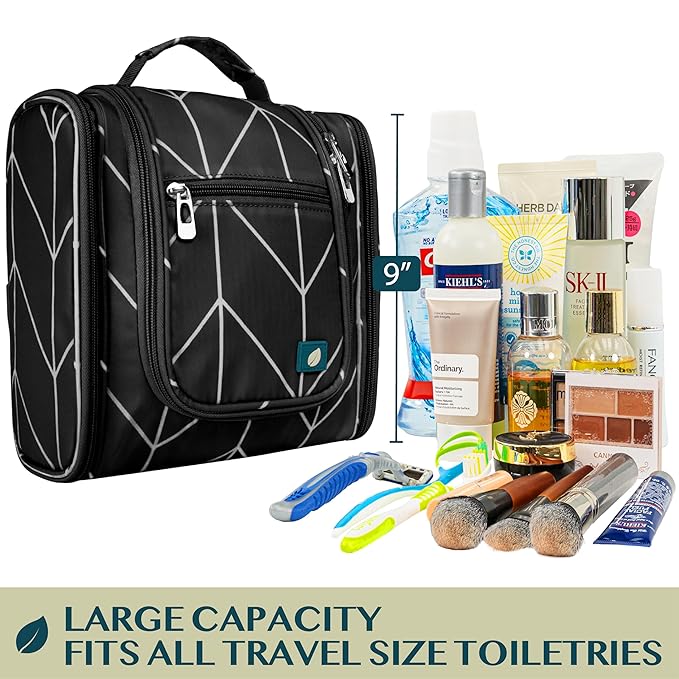 PAVILIA Toiletry Bag Travel Bag for Women Men, Hanging Cosmetic Organizer, Water Resistant Makeup Bag for Accessories Toiletries, Large Travel Essentials Kit (Black Chevron)