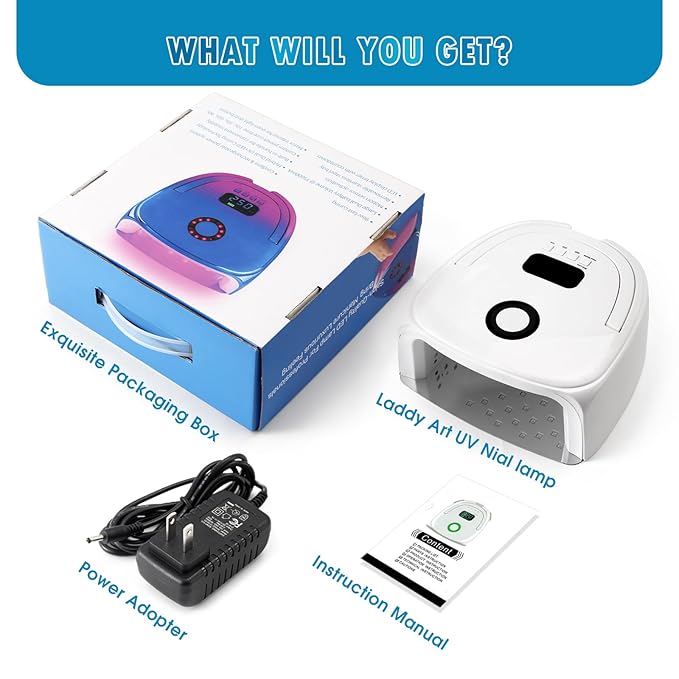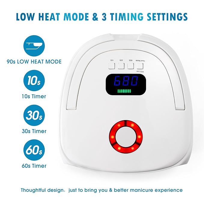 - Auto Sensor & 4 Timer Setting: Open the on/off button, the smart sensor will work auto, hand in light on, hand out light off. And this uv gel nail lamp has 4-timers setting(10S, 30S, 60S, 90S low), button control. If you do not choose the time setting, this nail light will be set auto, max last almost 120s. The LCD display not only shows the time that you need to wait, but also shows the power left on the nail light. No need to worry about that you forget recharge it.