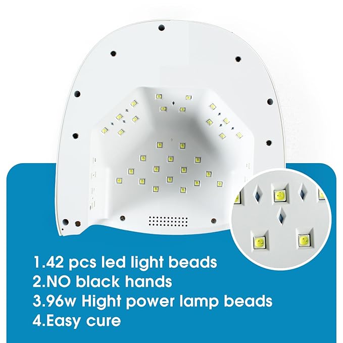 - Suitable for All Gel Nail Polish:This UV lamp can cure 5 fingernails or 5 toenails perfectly with 42 pcs light beads, which fulls cover 180 degree. And this professional nail dryer suits all gel nail polish, like acrylic, builder, sculpture gel, gem glue, base coat, gel/color coat and top coat etc, except the regular polish. But it can make the regular polish more durable and shiny after using the top coat cover on the regular polish and curing with the light.