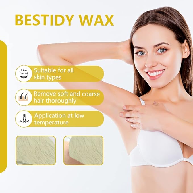 - 【Gentle】 Bestidy wax beads has low melting point, perfect for all skin types, enjoy smoother hair removal with comfortable temperature. Enjoy no strips, less painful hair removal at home. In a few minutes bring you smooth and hairless skin.