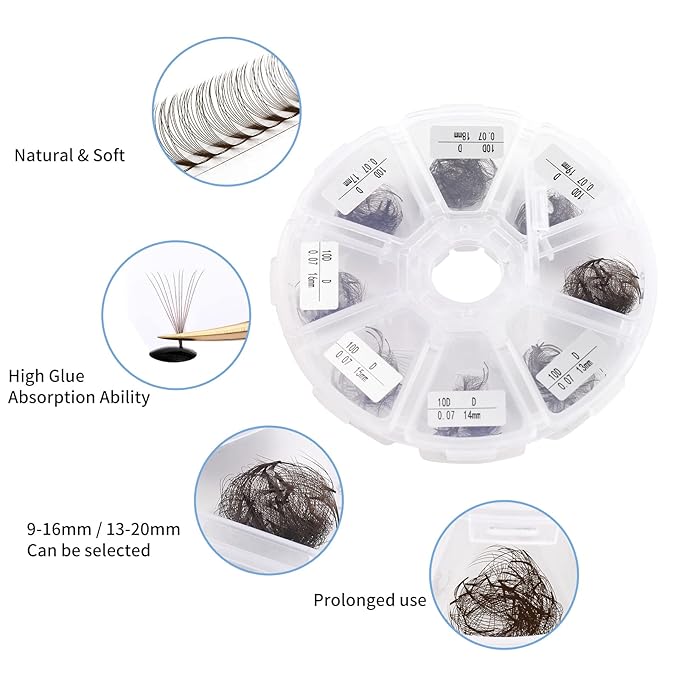 - ➤COLOR PREMADE FANS MIXED: WENDY LASHES premade volume eyelash extensions has 8 compartment , each compartment contains 63 fans lash extension for a total of 500. With C/D curl, 9-16mm /13-20mm. To meet all the needs of customers, it is perfect for all kinds of parties, shows and festivals.