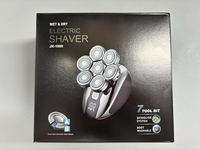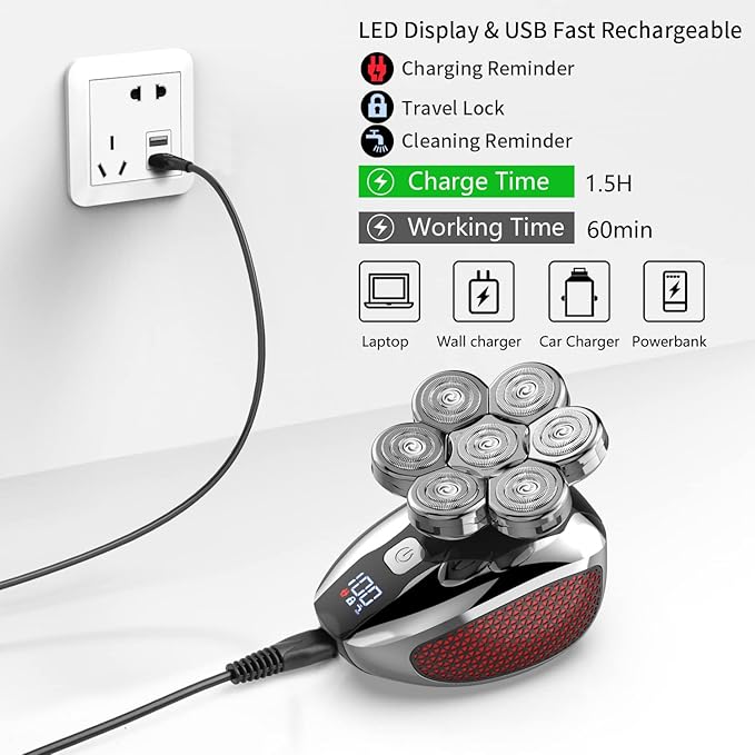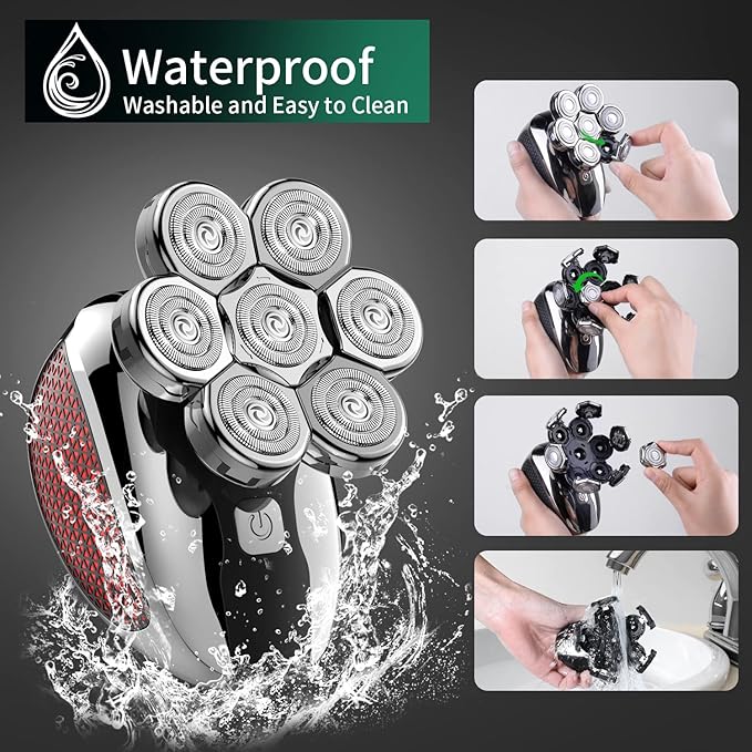 - 【7D Dual-Track Precision Shaver Heads】This head shaver for bald men features 7 floating heads and double ring blades for multi-directional shaving and increases the shaving area, with precise and sharp floating rotary blade heads automatically adapt to the contours of your head, face, neck and jaw in all directions, leaves no nicks, cuts, or any irritation marks, gives you a comfortable and smooth shaving experience and saves shaving time.
