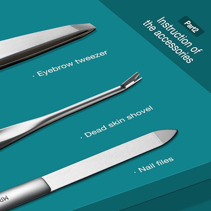 - All accessories are made of medical grade stainless steel, including:Eyebrow Tweezer, Cuticle Remover, Nail Files, Folding Nail Clippers, Facial Hair Scissors, Ear Picker.