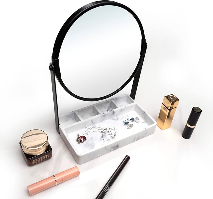 - MARBLE TRAY BASE: Marble tray can hold jewelry like earrings necklace and rings as well as lipstick and other small makeup products, Keep your makeup desk tidy,marble base is solid and beautiful,mirror for desk,table mirror with tray,makeup mirror with stand