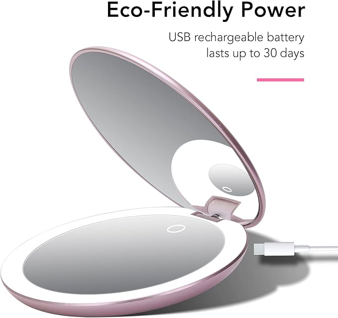Fancii Taylor LED Lighted Travel Makeup Mirror, Rechargeable with 10x/1x Magnifying & 3 Light Settings - Compact, Portable, Large 5” Wide Hand Mirror for Handbag and Purses (Rose Gold)
