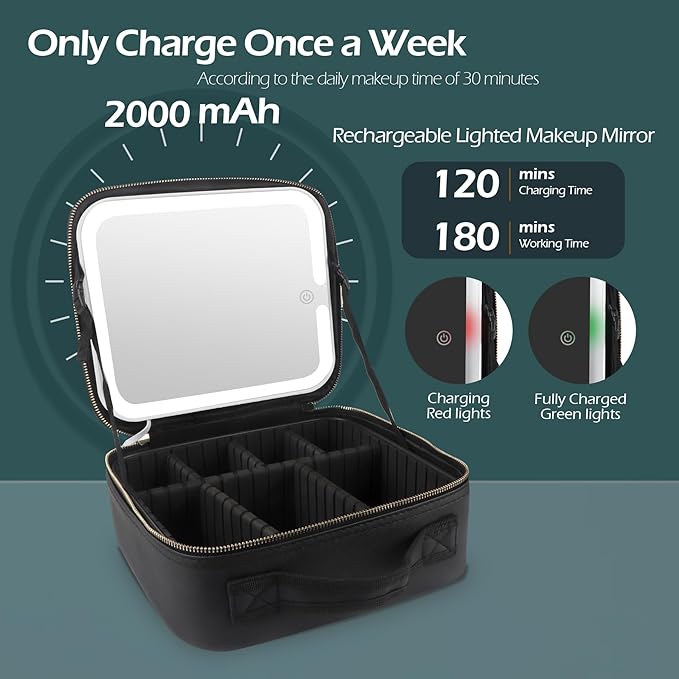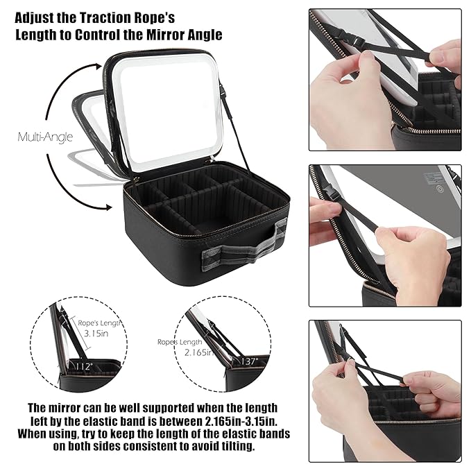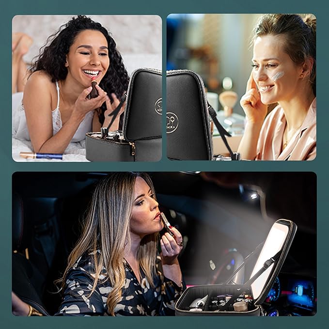 - đđ»ăMeticulous Selection of Materials, High Standard ProductionăDouble zippers of this lighted makeup case are controlled by high standards from chain cloth selection, sprocket arrangement, polishing, electroplating, and subsequent oil sealing and waxing processes to ensure smoother pulling. Specially customized sturdy plastic case for fixing the vanity mirror, whether it is placed in the luggage or directly on the car, the mirrorâs surface will not break.