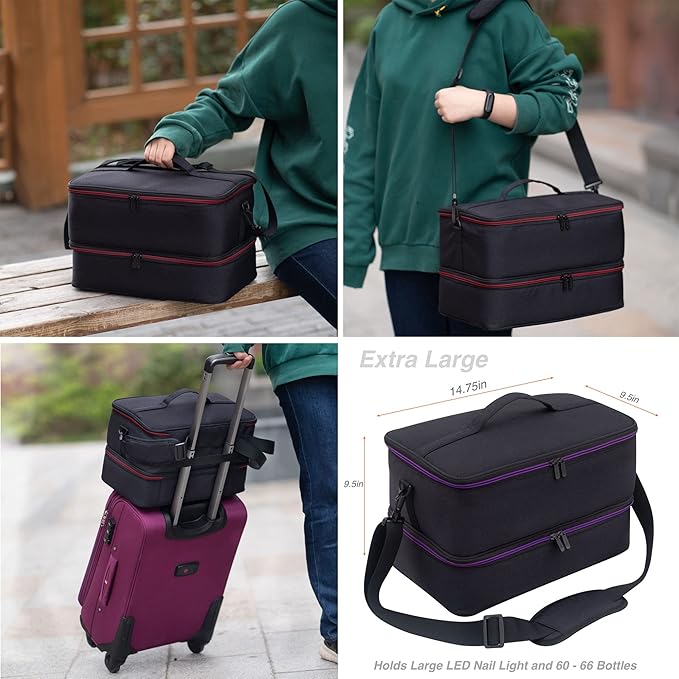 - Updated in Sep 2022: Extra large double compartments nail polish and uv light organizer carrying case. Storage for LED UV lamp dryer and nail tool kit and supplies. Made of heavy duty materials for long lasting performance. Well padded outer shell provides superb protection to nail polish bottles. This sturdy nail polish travel case is ideal for both professionals and nail hobbyist. Please note: this case is quite large. Check out the dimensions before you buy