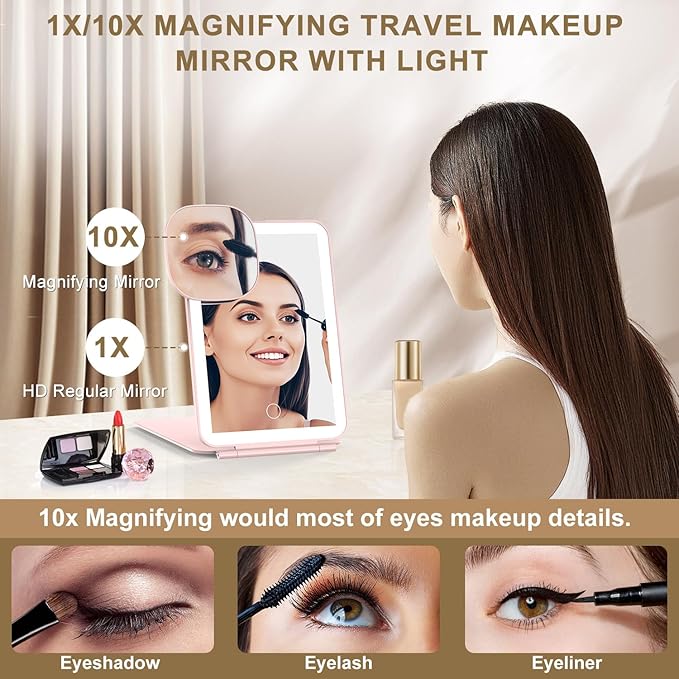 - 【Simple operation】:The mirror can be self-standing. It has highly sensitive and long-lasting touch buttons. Short press to switch on and long press to adjust the brightness. There’s color temperature memory light function. It comes with a bonus of a small 10 x magnifying mirror.