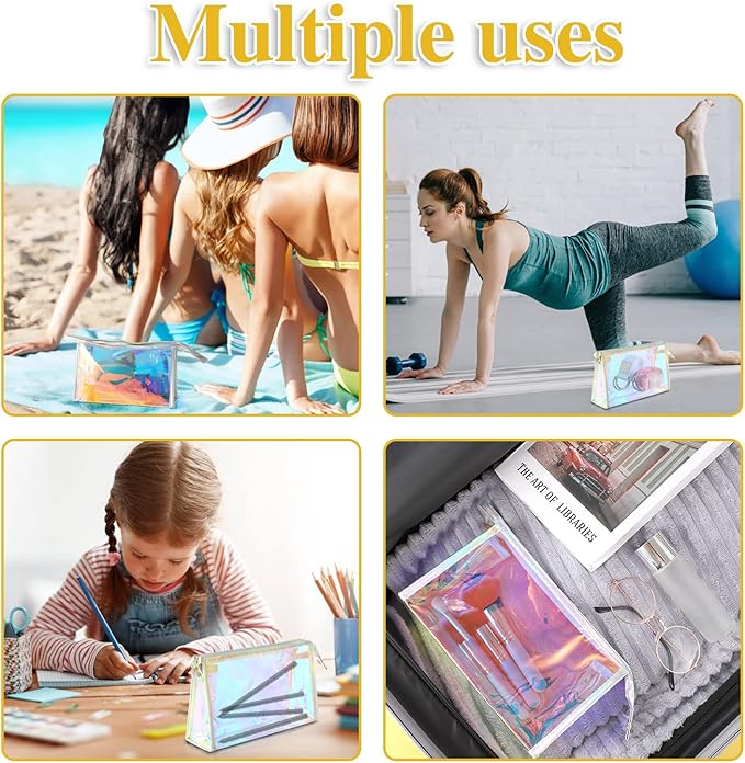 - 【10 Cosmetic Bags】You will get 10 pieces holographic iridescent cosmetic bags (pink edging), simple and stylish, with dimensions of 8.5×5.5×2.8 inches, with enough space to hold all your cosmetics.