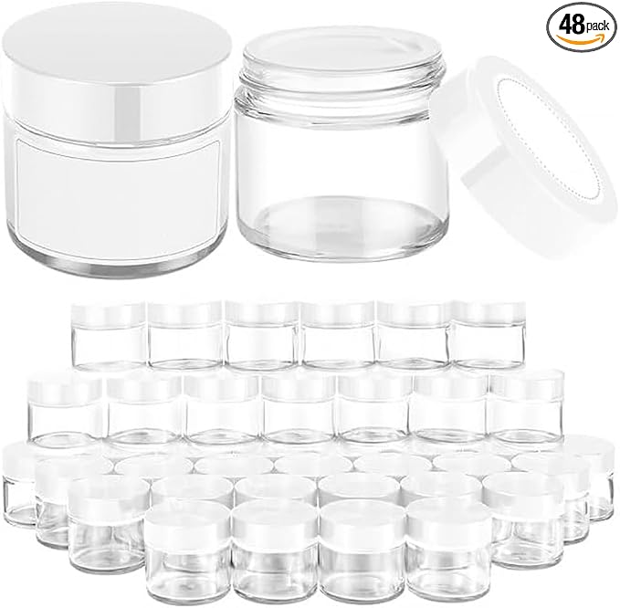 2 oz Glass Jars with Lids, 48 pack Clear Round Small Containers with White Lids, Blank Labels & Inner Liners, Empty Cosmetic Containers for Sample, Powder, Cream, Lotion