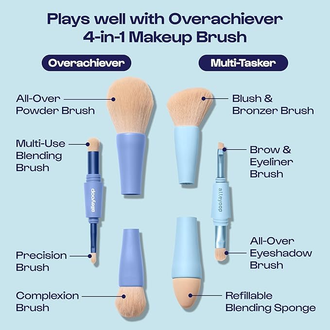 Alleyoop Multi-Tasker 4-in-1 Travel Makeup Brush Set – Compact Makeup Brushes with Blending Sponge, Eyeshadow, Eyebrow & Liner, Blush & Bronzer Brush – Mini Makeup Tools Kit for Women, Vegan