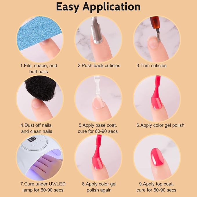 - Healthy Ingredients for Worry-free Manicures: Our eco-friendly nail gel kit with uv light is crafted with natural resin and a professional-grade formula. Its silky texture glides onto your nails effortlessly, while the soft brush allows for precise application in any direction. Whether you're a novice or a professional, enjoy a relaxed manicure with our healthy and friendly formula.