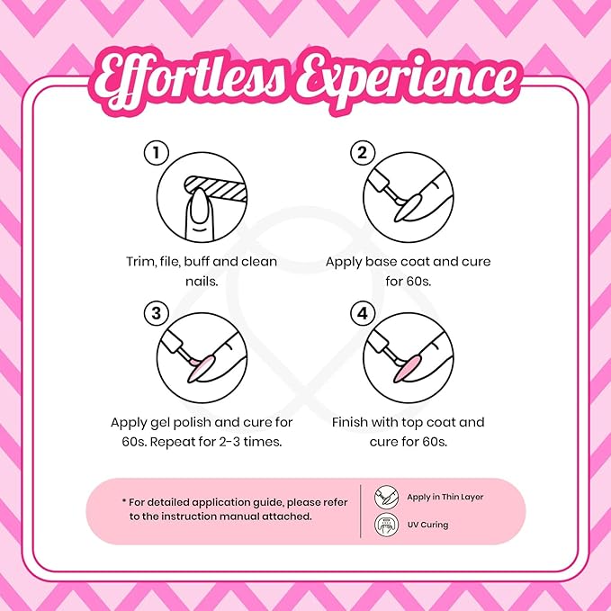 - Speed Curing with LED Nail Lamp: The gel nail polish kit needs to be cured under LED light. Base and Top coat required. Average curing time for LED light is 60-120 secs.