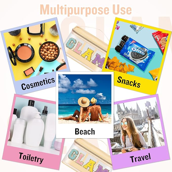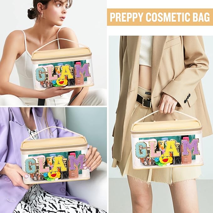 - ❤【Glitter Chenille Letter Clear Bag】Preppy makeup bag pouch has gold glitter letter patches and the letters are made of delicate towel embroidery and non-woven fabric. Firmly stained on the bag, you don't have to worry about them falling off. These colorful letters have a gold glitter border to make your clear makeup bag look very bright and vivid!