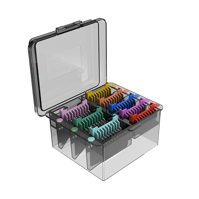 - 🐱 What You Get: Set of 8 stainless steel guide combs for pet grooming and a storage box .