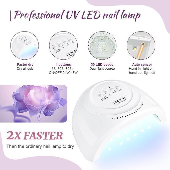 - Nail Lamp: This nail lamp has 3 curing modes, 5s, 30s, 60s, one minute to cure gel nail polish. And it contains 30 led small light beads and can cure each nail in all directions. Smart nail lamp, hand in, the light is on; hand out, the light is off.