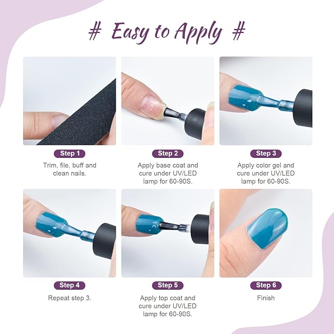 - Health Ingredients: Gel nail polish is made of natural resin, health substance and professional formula. The texture is silky, which can be easily smeared; The brush is soft and can be applied in all directions. It is very friendly to novices and professional manicurists. Please use them with confidence.