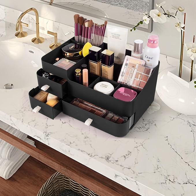 Makeup Organizer for Vanity, Large Countertop Organizer with Drawers, Cosmetics Storage for Skin Care, Brushes, Eyeshadow, Lotions, Lipstick,Nail Polish.Great for Dresser, Bathroom, Bedroom, Black