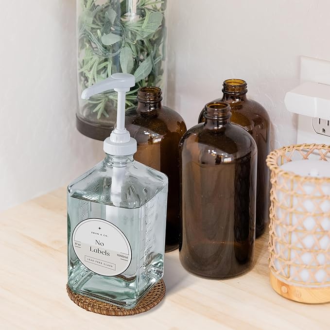 - Enjoy a refreshing and convenient mouthwash experience with eBun Mouthwash Decanter Set, which includes a BPA-free pump dispenser, a large 37-oz lead-free glass bottle, two big 2.3 oz reinforced glass cups, a handcrafted wicker coaster, and a silicon collapsible funnel.