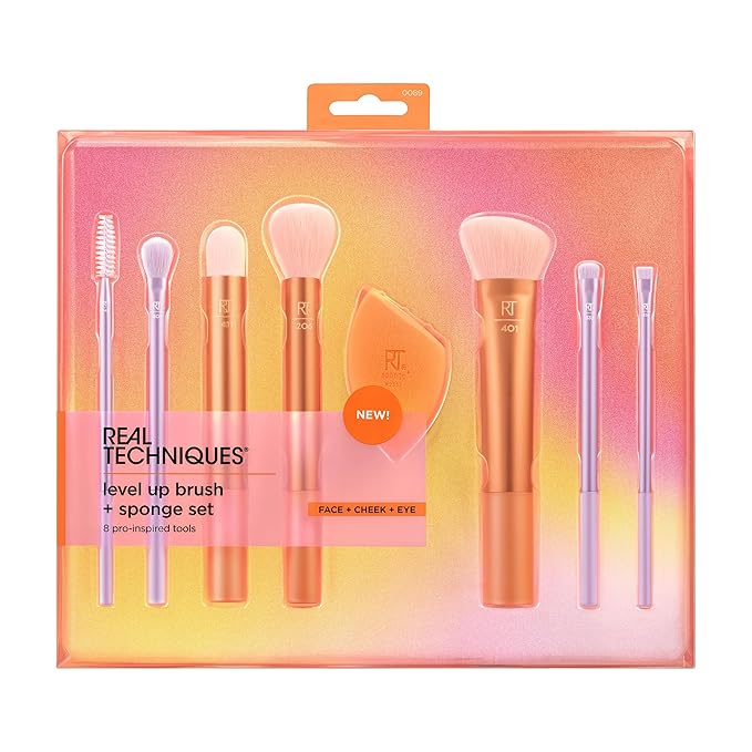 - The Real Techniques Level Up Brush plus Sponge Set curates 8 makeup tools for your face, cheek, and eyes
