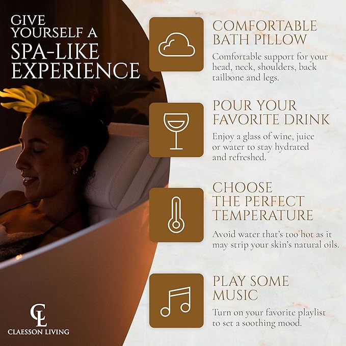 - SPA-LIKE COMFORT: Measuring 17'' x 49'' our bath pillow offers full-body relaxation. With super-soft filling and a thick headrest, it supports your neck, back, shoulders and tailbone. And since it's made with breathable fabric, it's gentle on skin.