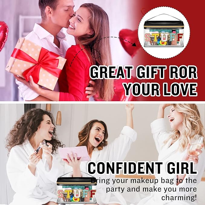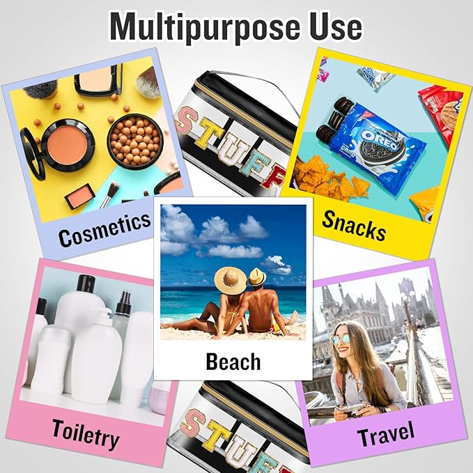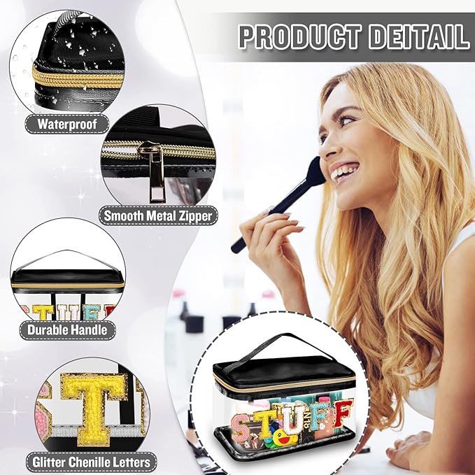 - ❤【Glitter Chenille Letter Clear Bag】Preppy makeup bag pouch has gold glitter letter patches and the letters are made of delicate towel embroidery and non-woven fabric. Firmly stained on the bag, you don't have to worry about them falling off. These colorful letters have a gold glitter border to make your clear makeup bag look very bright and vivid!