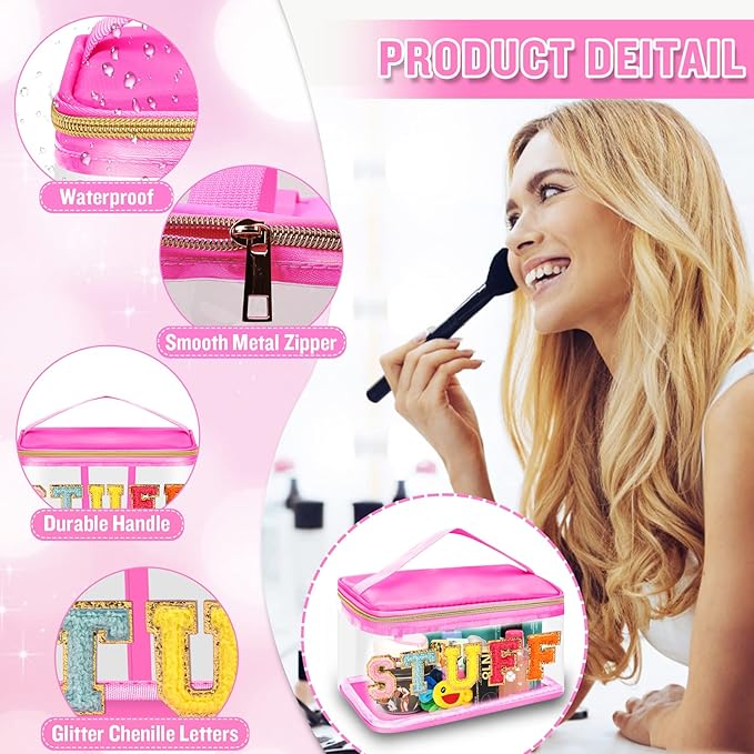 Chenille Letter Clear Makeup Bags Stuff Pouch, Preppy Patch Makeup Bag Zipper with Handle, Transparent PVC & Nylon Waterproof Glitter Cosmetic Handbag Travel Toiletry Storage for Women(STUFF-Rose)