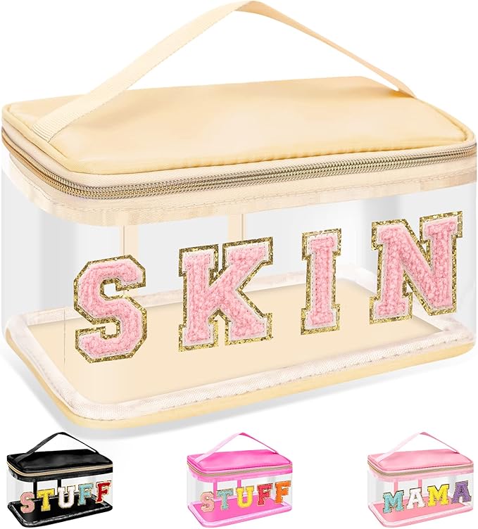 Chenille Letter Clear Makeup Bags Skin Pouch, Preppy Patch Makeup Bag Zipper with Handle, Transparent PVC & Nylon Waterproof Glitter Cosmetic Handbag Travel Toiletry Storage for Women Girl(SKIN-Beige)