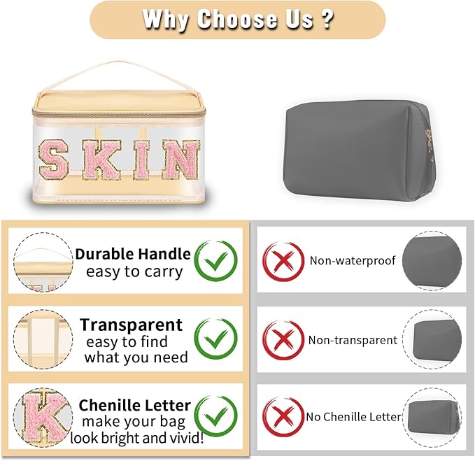 - ❤【Clear Makeup Bags Materials】Chenille letter clear cosmetics bag is mainly composed of high-quality pvc waterproof material, which does not fade, has no peculiar smell, and is durable. The top and bottom are wrapped in waterproof nylon for a stylish look, durable and easy to wipe clean, dust and water resistant to easily protect your personal belongings.
