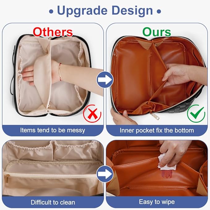 - ✅【Upgrade PU Leather Lining】 - Our checkered cosmetic bag is made of high-quality and thick PU Leather on the Inner lining and outer, which can hold its shape without collapsing and is more durable than similar products. The stain-resistant leather lining can be easily wiped to solve your troubles with cosmetic stains