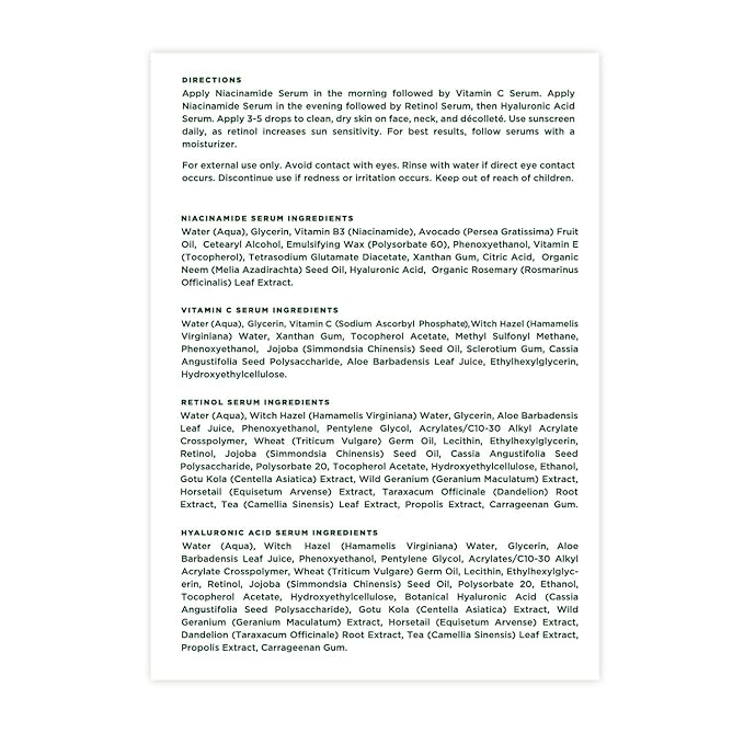 - EASY TO USE DIRECTIONS: Apply Niacinamide Serum in the morning followed by Vitamin C Serum. Apply Niacinamide Serum in the evening followed by Retinol Serum, then Hyaluronic Acid Serum. Apply 3-5 drops to clean, dry skin on face, neck, and décolleté. Use sunscreen daily, as retinol increases sun sensitivity. For best results, follow serums with a moisturizer
