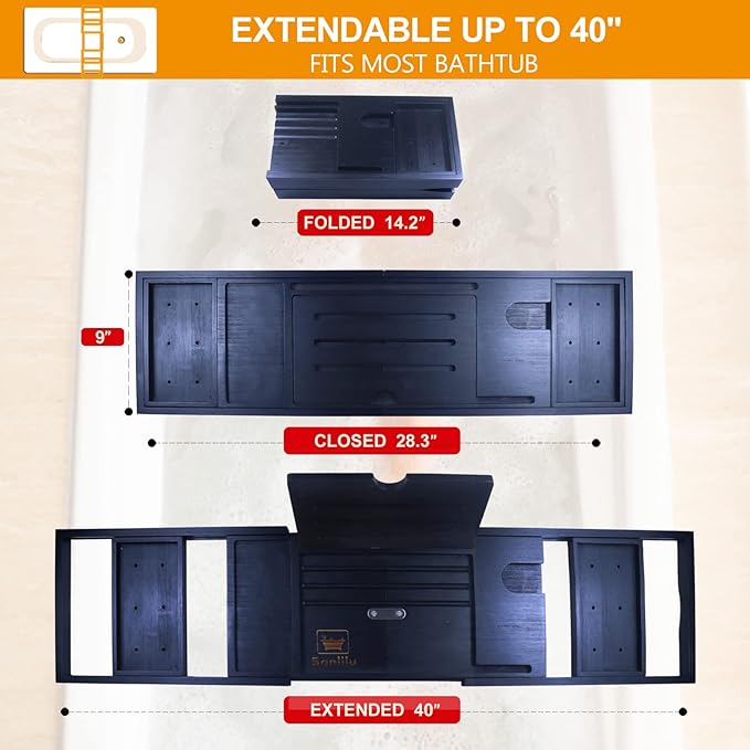 Premium Bathtub Tray Caddy - Expandable Bath Caddy Tray - Adjustable Bamboo Bath Caddy Tub Table - Unique House Warming Gifts New Home - Black