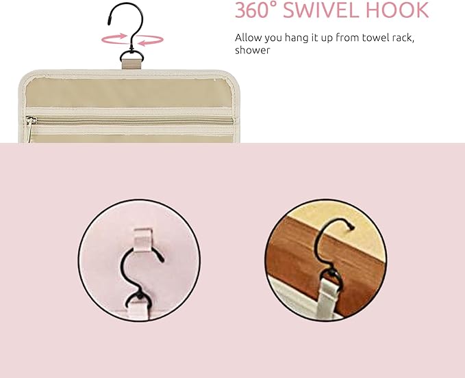 - High-Quality Travel Makeup Bag: Surface material is waterproof polyester-peach-skin, easily clean it out with a wipe. gold zipper works smoothly. 360° hook save counter space