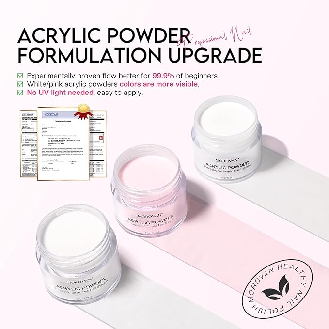 - Professional Nail Set with Salon-quality - Morovan Acrylic Powder is a Bubble-free polymer that will also offer extraordinary clarity and provide a smooth self-leveling finish. With this nails kit acrylic set, You will get long-lasting and non-yellowing acrylic nails, acrylic powder takes 6~7 minutes to completely dry, offering the beginners the enough time to create or adjust nail art.